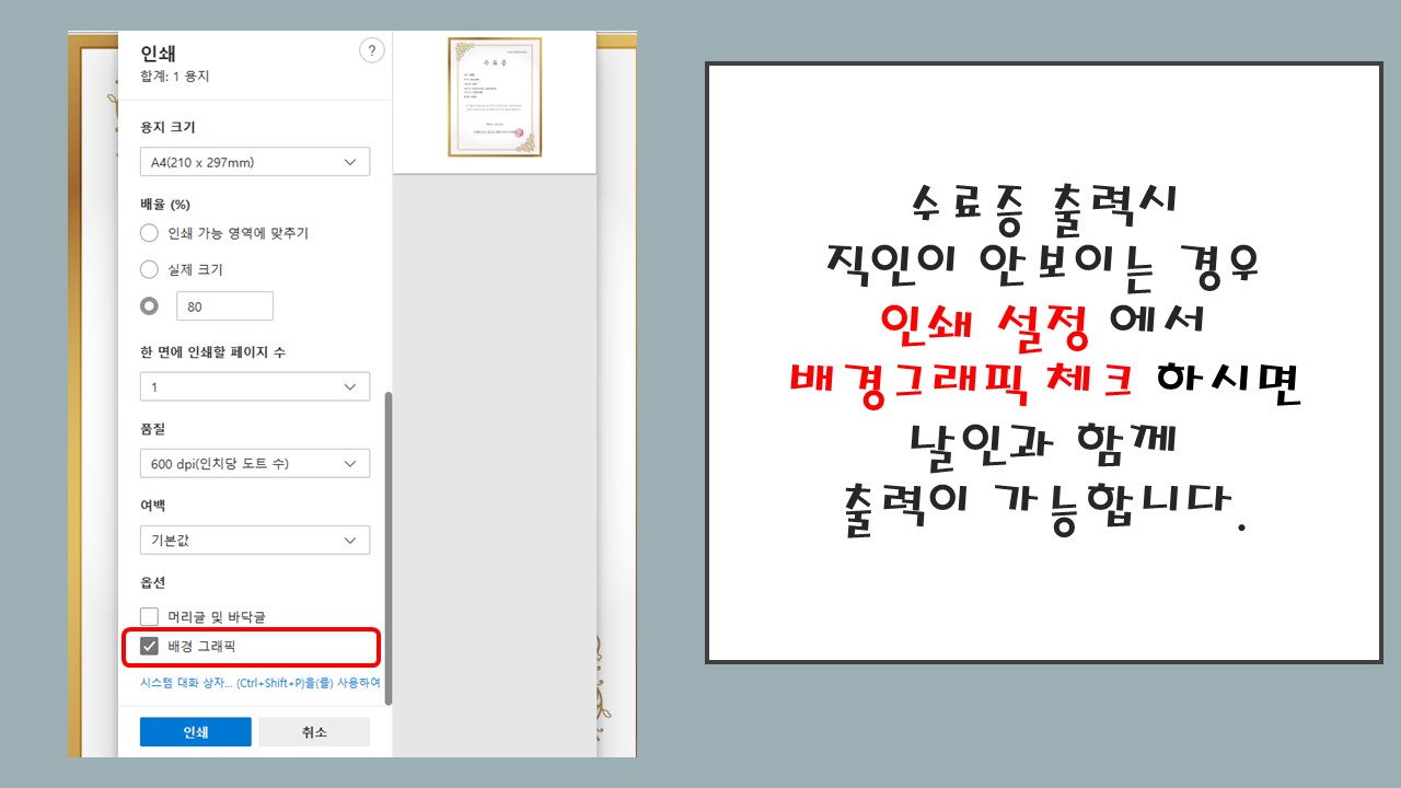 인쇄설정에서 배경그래픽 체크 하시면 날인과 함께 출력이 가능합니다.